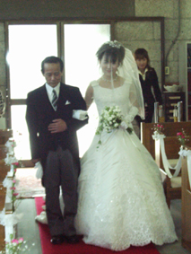 | ↑ バージンロードを新婦『なっちゃん』の入場 綺麗ですね♪ お父さんの複雑な心境が・・・私にも娘が居ますが20数年先に解かるんかな??? ↓ 2人で宣誓を詠んでましたが ガチガチに緊張した新郎とずっと笑顔の新婦でした |